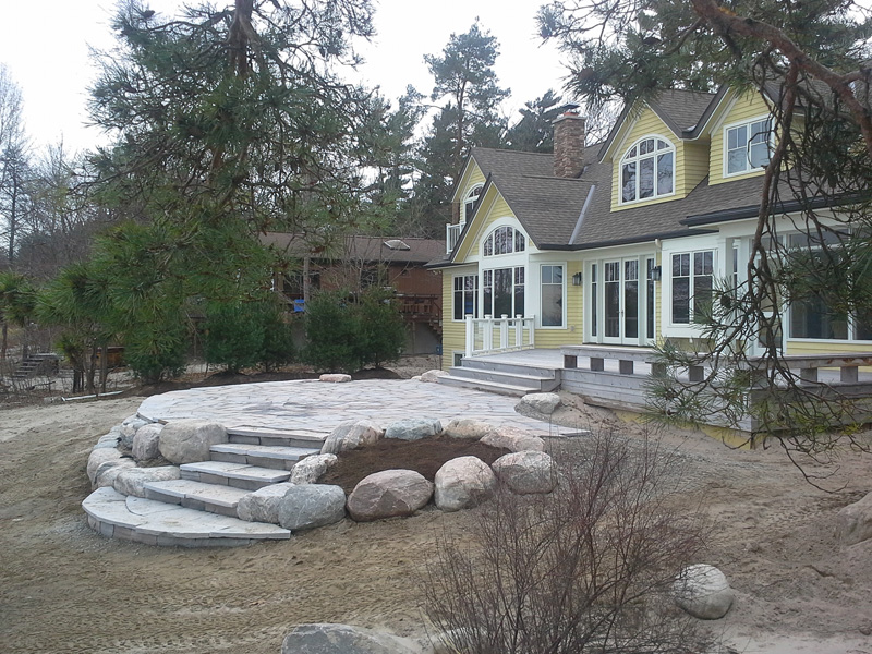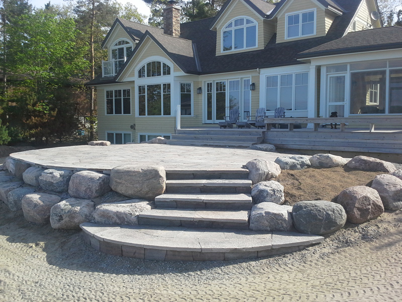 Natural stone landscaping in Parry Sound / Muskoka and the Georgian Bay Area. Quality flagstone hand carved and dry laid. Transform bush into trails down to waters edge with terraced patio's walkways and steps used to turn steep grade cottage lots into fine estates on Lake Muskoka, Joseph, Rosseau, and the Georgian Bay. All work guaranteed.