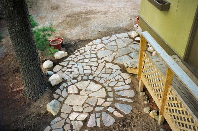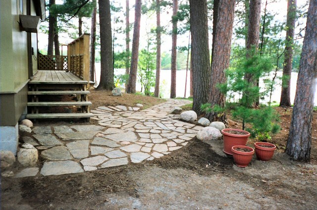 Natural stone landscaping in Parry Sound / Muskoka and the Georgian Bay Area. Quality flagstone hand carved and dry laid. Transform bush into trails down to waters edge with terraced patio's walkways and steps used to turn steep grade cottage lots into fine estates on Lake Muskoka, Joseph, Rosseau, and the Georgian Bay. All work guaranteed.