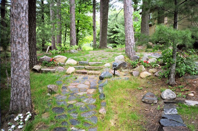 Natural stone landscaping in Parry Sound / Muskoka and the Georgian Bay Area. Quality flagstone hand carved and dry laid. Transform bush into trails down to waters edge with terraced patio's walkways and steps used to turn steep grade cottage lots into fine estates on Lake Muskoka, Joseph, Rosseau, and the Georgian Bay. All work guaranteed.